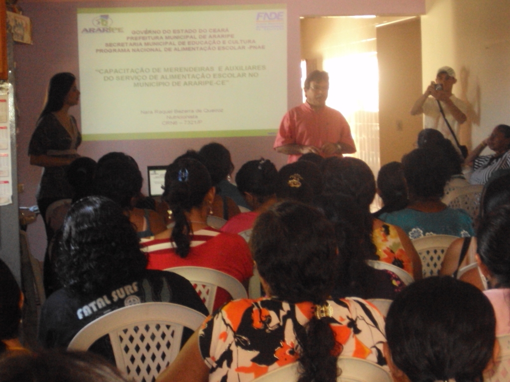 Nos dias 17 e 18 de Abril deste ano, foi realizado pela Nutricionista do Município de Araripe, Dra. Nara Raquel Bezerra de Queiroz, a Capacitação de Merendeiras, com o tema central: “Boas Práticas na Manipulação de Alimentos”. Na abertura, houve a participação do Prefeito do Município, Dr. Germano, que falou sobre a importância de oferecer uma alimentação de qualidade para os alunos da rede municipal de ensino, além da importância do papel da merendeira para um bom andamento do Programa de Alimentação Escolar.